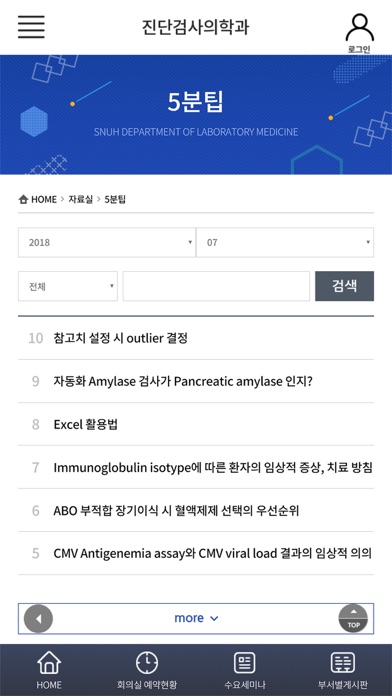 ◎설명 -서울대학교병원 진단검사의학과 앱으로 진단검사의학과에 대한 유용하고 최신의 정보를 더욱 편리하게 이용 하고 활용 할 수 있으며, 여러분야의 검사를 검색하고 새로운 검사안내 정보를 확인할 수 있습니다. ◎검사안내 -검사항목검색 -검사의뢰 일반원칙 -새로운 검사안내 -신규검사요청 ◎자료실 -공지사항 -수요세미나/학술대회 -수요세미나발표자료 -회의실예약현황 -학술자료 -뉴스레터 -인증관련자료실 -5분팁 ◎부서별 게시판 -진단검사의학과 -의국 -진단혈액 -자동화 -특수화학 -진단면역 -분자진단 -혈액은행 -미생물 -채혈실 -진단검사QM -소아진단진단검사의학팀 -종양진단진단검사센터 ◎회의실예약현황 -회의실예약 -회의실예약현황 ◎공지사항 URL : http://snuhlab.org 전화번호 : 02-2072-2114 개발 : 서울대학교병원 진단검사의학과