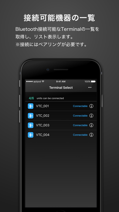 intdash Edge Moduleを搭載したTerminalSystems(以下Terminal)の状態を可視化します。 intdashサービスをご契約いただいているお客様向けのアプリケーションです。 当アプリとTerminalをBluetoothで接続することで、Terminal本体が持っているステータス情報、および各種データをアプリ上で確認可能です。 ・接続可能な機器の一覧を表示 Bluetooth接続可能なTerminalの一覧を取得し、リスト表示します。 ※接続にはTerminalとのペアリングが必要です。 ・Terminalの状態を可視化 接続中はリアルタイムでTerminalの状態を取得、更新して表示します。 ハードウェア情報、ネットワーク情報等を表示します。 - 再送データサイズ - GPS捕捉 - ネットワーク状況 - ストレージ容量 ・プロセスの状態を表示 プロセスの状態を確認することができます。エラー発生箇所などの状況確認が可能です。