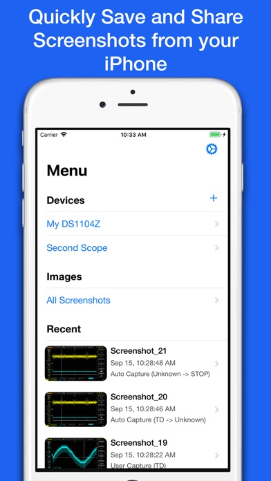 Use Capture to take screenshots and control your Rigol DS1000Z/MSO1000Z Oscilloscope, from your iPhone or iPad. Then quickly share screenshots via email or to other apps. The fastest and easiest way to capture and share screenshots from you oscilloscope! - Automatically capture screenshots when scope is triggered, - Remote Trigger Oscilloscope, - Save screenshots directly to iPhone/iPad Camera Roll, - Invert screenshot color, - Capture screenshots in black and white, - Save to both App and Camera Roll, - Share screenshots with other Apps with a single tap, - Automatically refresh screenshot, - Automatically save every screenshot, - Remote controls scope from iPhone/iPad, - Support for multiple oscilloscopes, Note: App requires Rigol DS1000Z or MSO1000Z series oscilloscope that has updated/unlocked to support LXI networking. Some app features may not work on all oscilloscopes.
