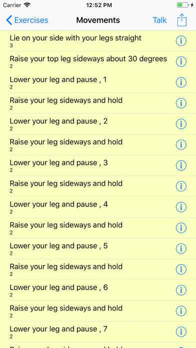 Physio Pal is an exercise app aimed at physiotherapy, exercises, Tai Chi and other list/detail applications. It has a voice synthesizer built in to talk you through the movements of your selected exercise to free up your hands and eyes during the exercise. A built in time programmable delay permits each movement to be defined by you and completed on time for the next movement. Each exercise and list of movements is entirely under your control. You can create, add, remove, move and edit each of the exercises and movements to suit your personal needs and desires. Have fun with this very flexible app.