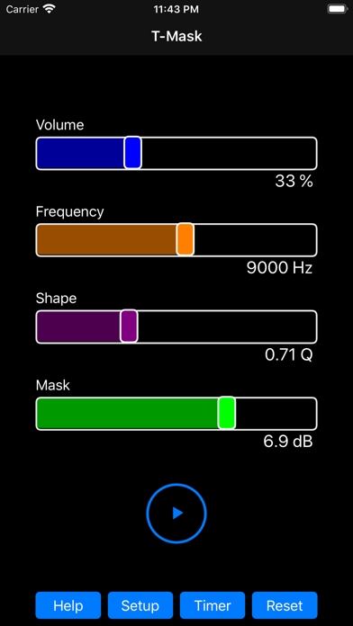 T-Mask is a tinnitus masker. T-Mask generates a white noise where a selected frequency can be masked. When the masked frequency matches the frequency of the hissing/ringing caused by your tinnitus, playing back this noise masks the hissing/ringing. A white noise runs on all frequencies we can hear. By masking only the frequency affected by the tinnitus, T-Mask allows the brain to hear all frequencies (white noise + perception of tinnitus) at the same energy: that is equivalent to not hearing the tinnitus (or to reducing its perceived intensity).