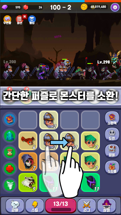 몬스터 합성 전략 배틀! 간단한 퍼즐로 몬스터 진화! 방치형 퍼즐 RPG 게임 - 머지몬 ( Merge Monster ) 간단한 퍼즐 이용한 키우기 게임! 간단한퍼즐로 주변에 있는 같은 종류의 몬스터들끼리 합성해서 더 강력한 몬스터를 키우세요. 다양한 형태의 몬스터들을 조합해서 나만의 조합을 만들자! 더 강력한 나만의 조합을 만들어서 다른 유저들과 대전해 보세요 매주 진행되는 리그전에서 높은 순위를 차지해서 보상을 획득하자! 리그전 최강자는 과연 누구~? *비 정상적인 방법으로 게임이 종료되면 데이터가 손상될수있습니다. *게임을 지우면 세이브 데이터도 같이 삭제되니 주의해주세요 *옵션 > 데이터 클라우드 저장이 가능합니다