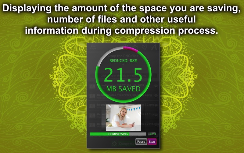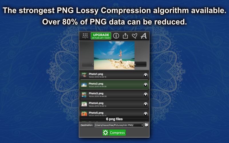 The main purpose of the "mini PNG Lite" tool is to decrease the size of PNG images to save you a lot of space. Use this tool to compress your PNG files, so that they take up a lot less space in your apps, on your websites, in your emails, on your USB drives, etc. "mini PNG Lite" Features: - The strongest PNG Lossy Compression algorithm available. Over 80% of PNG data can be reduced. - Drag & Drop PNG images and folders into the app window. - An option to preserve the original structure of files and folders, as well as copying images, texts and other non-PNG files. - You can preview all dropped PNG files before and after compression using the embedded viewer. - During the compression process, the tool displays the amount of space saved, the number of files and other useful information. - Batch conversion support. - Compression of high resolution images. - A special optimization path for grayscale images. - You can change the destination for your compressed PNG files. - After the comression is complete, the tool notifies you and displays the destination folder. - And much more. QUESTIONS OR COMMENTS? If you have any questions and/or comments, please contact us using the support link located on this page.