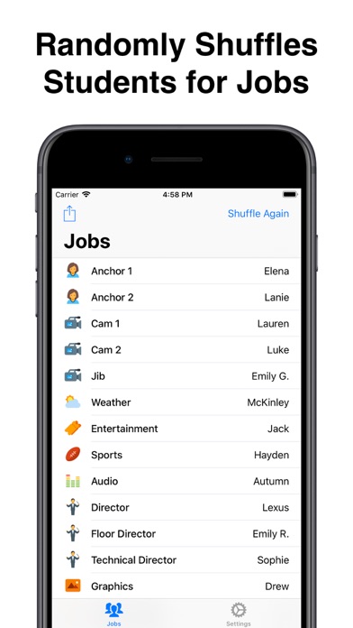 The Class Shuffler app is designed for classrooms with hands-on workflows. It shuffles all the names you enter and assigns them to a random job in the classroom. Features: Have Up to 5 Lists of Students Now every class can have random jobs. Add or Remove as Many Jobs as you'd Like Because every class has a different workflow. Shows Students without Jobs So no student is left out of the fun. Lightweight, Ad-Free, and Fast Because we all just want to get things done quickly. Beautiful Job Icons Every job has an icon that goes with and can help you find a certain job quickly. Reveal Mode Hide all the names until you tap on them to have an exciting reveal in from of a class! Made with love in Tennessee.
