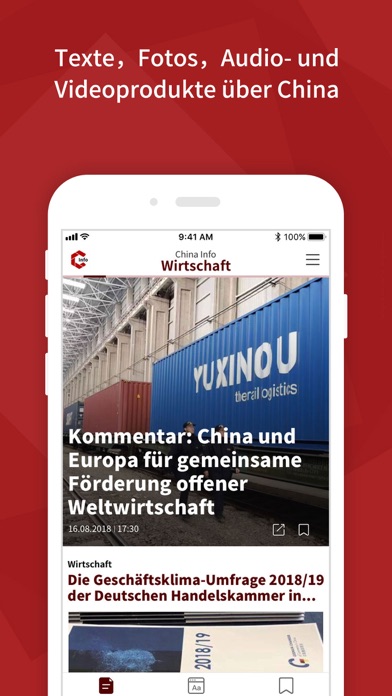 Das China Info-Team versorgt Sie mit umfassenden und interessanten Informationen über China. Die China Info-App bietet Ihnen: - Nachrichten, Reportagen, Interviews, Fotos, Audio- und Videoprodukte über China. - Push-Nachrichten auf Ihr Smartphone. Sie erhalten Eilmeldungen und Hinweise auf besonders wichtige Nachrichten. In den Einstellungen können Sie die Eilmeldungen abstellen oder stumm schalten. - Merkliste und Leseverlauf in Ihrem Profil. - Übersetzer. Sie können über das Mikrofon-Symbol Worte einsprechen und in Chinesisch oder Deutsch übersetzen und vorlesen lassen. Mit der Kamera können Sie auch komplexe chinesische Schriftzeichen scannen und übersetzen lassen. - Offline-Lesemodus. Sie können Artikel herunterladen und jederzeit auch ohne bestehende Internetverbindung lesen. - Interessante Reiseberichte, praktische Reiseführer, leckere Spezialitäten. Sie können einfach das GPS-Icon drücken und dann Ihr gewünschtes Reiseziel erreichen. - Chinesisch lernen. Sie können mit Popsongs Chinesisch lernen. - Kommentieren. Sie können alle Artikel kommentieren und die Kommentare anderer Nutzer einsehen. - Wir sind gespannt auf Ihre Kommentare und Feedback und freuen uns auch über Ihre Bewertungen hier im Store.
