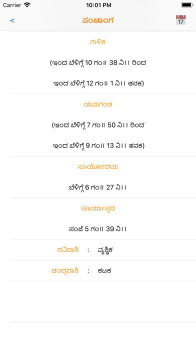 Kannada Calendar or Kannada Panchangam is an almanac for people of Karnataka and Kannada speaking community around the world. This app gives details of Panchangam for every day of 2018 and 2019. Apart from giving details for Bangalore (India), it also gives details for other places like Los Angeles (America), Chicago (America), Dubai (UAE), London (UK), Singapore (Singapore) and Sydney(Australia). Following details are covered in the app: Samvatsaram Ayanam Masam (Month) Rutuvu (Season) Kalam Varam Paksham Thithi Nakshatram Yogam Karanam Varjyam Amrutakalam Durmuhurtham Rahukalam Gulikakalam Yamagandam Suryodayam (Sunrise) Suryasthamayam (Sunset) Surya Raasi Chandra Rassi Good time and not good time and important festivals are also included. Any day in the year 2018 and 2019 can be selected. A calendar view is provided which gives information at a month level. Using settings screen a different place can be selected.