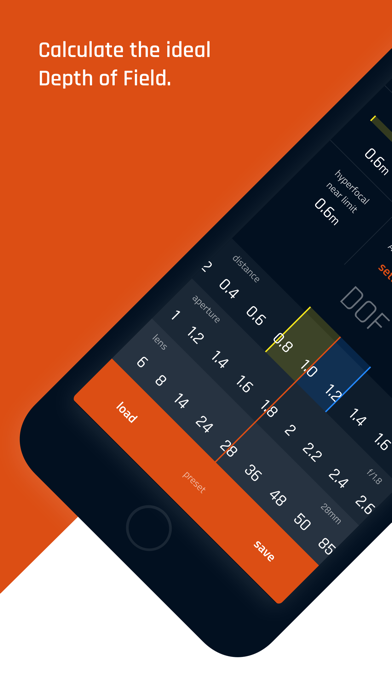 No more messing about with a cardboard Guild Kelly calculator. Calculate the ideal Depth of field for your cinematic production with three simple sliders for distance, aperture, and lens. Got your perfect settings? Great! Now save it for future projects, ready to be loaded any time you need it. Once you select your gear from an extensive list of modern and vintage cameras, all you have to do is pick your distance, aperture, and lens from the 3 sliders. All the calculations you need to set up that perfect shot are instantly available as you slide the values. A simple and minimal interface helps you focus on fine-tuning your settings one-handed. Your thumb is in the sweet spot of the screen where you can move the sliders with precision and ease. Whether you prefer metric or imperial DOF Cinema has you covered. There are settings for distance measurements in meters or feet. Aperture range starts from f/0.5 up to f/64 with or without hard stops. Focal length extends for super wide angle lenses from 3 mm all the way to 1200 mm telephoto. The distance scale starts from 0.01 meters up to 9000 meters. Cameras are plentiful. DOF Cinema features a vast collection of camera models from Arri, Blackmagic, Red, Panasonic, and Sony. Including film formats like Super 16, Super 35, Full Frame, and medium format is also available. The app offers plenty of customization with options that include extending the distance slider for macro, telephoto, and superzoom distances, haptic feedback, aperture hard stops. Upgrade to DOF Cinema today and enjoy the benefits of loading your favorite settings. Stay in focus!