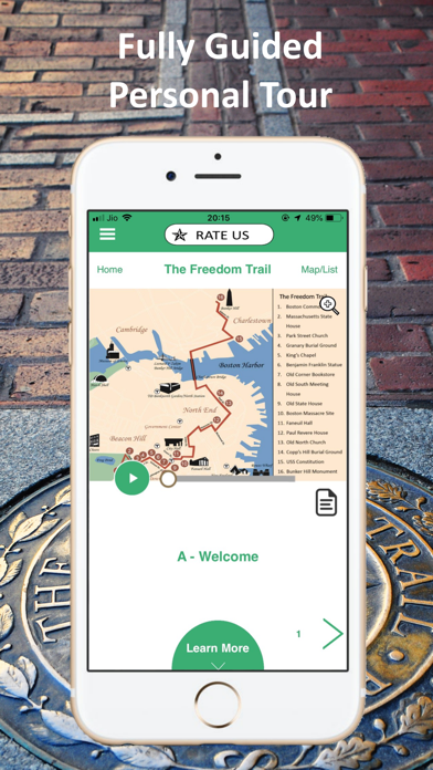 Welcome to the narrated walking tour of Boston’s Freedom Trail by Action Tour Guide, where the American Revolution began! Are you ready to turn your phone into a personal tour guide? This app offers a fully-guided experience of historic Boston - just like a local giving you a personalized, turn-by-turn, fully-guided tour. Boston’s Historic Freedom Trail: Walk down storied streets in the footsteps of the founding fathers. Hear the story of how the first sparks of revolution flew in Boston, and how those sparks became an inferno that engulfed the American colonies. The architects of the revolution come alive along this historic trail as you pass sights like the Boston Common and the Old North Church, where Paul Revere’s famous lanterns once hung. Learn about the Sons of Liberty and the webs of conspiracy and unrest which once threatened to shatter Boston into a thousand pieces. Uncover the truth about misunderstood events like the Boston Massacre and the Boston Tea Party. See the city of Boston in a brand new light as we take you back to the time of John Hancock, Paul Revere, and Benjamin Franklin, all without having to fuss with a map! As you walk, audio stories will automatically pop up and start playing. It’s revolutionary history like you’ve never heard it before. See all these historic sites along the Freedom Trail: ■ Boston Common ■ Massachusetts State House ■ Park Street Church ■ Granary Burying Ground ■ King's Chapel ■ Franklin Statue ■ Old Meeting House ■ Old Corner Bookstore ■ Old State House ■ Boston Massacre Site ■ Faneuil Hall ■ Paul Revere House ■ Old North Church ■ Copp's Hill Burying Ground ■ USS Constitution Museum ■ Bunker Hill Monument RAVE REVIEWS: “This was an amazing way to walk the Freedom Trail!!! The tracking through the GPS was spot on and it was having all the information provided on all the points!!!” “I did not know a lot about the American revolutionary war and without overwhelming me, it brought the events of the time to life for me” “Excellent stories must buy. A nice walk and easy to follow” APP FEATURES: ■ Plays automatically The app knows where you are and which direction you are heading, and plays audio automatically about the things you are seeing, plus stories and tips and advice. Simply follow the GPS map & the routing line. ■ Fascinating stories Be immersed in an engaging, accurate, and entertaining story about each point of interest. The stories are professionally narrated and prepared by local guides. Most stops also have additional stories that you can optionally choose to hear. ■ Works offline No data, cellular or even wireless network connection needed while taking the tour. Download over Wi-Fi/Data Network before your tour. ■ Freedom of travel Explore on your own time, at your own pace, and with the flexibility to linger at stops that interest you. You have total freedom to skip ahead, stop and restart, and take as many photos as you’d like. ■ Award-winning platform The app developers received the famous “Laurel Award” from the Newport Mansions, who use it for over a million tours/year. FREE DEMO vs FULL ACCESS: Check out the totally free demo to get an idea of what this tour is all about. If you like it, purchase the tour to get full access to all of the stories. QUICK TIPS: ■ Download ahead of time, over data or WiFi. ■ Be sure the phone battery is fully charged, or take an external battery pack. Continued use of GPS running in the background can dramatically decrease battery life. This app uses your location service and GPS tracking feature to allow real-time tracking of your route. NEW TOURS ADDED! ■ Boston Ghost: Welcome to Boston, home of the American Revolution, site of the Tea Party, and a hotspot for…. ghosts? That’s right — this historic city is full of dark graveyards, spooky sightings, and haunted houses. ■ Harvard Square ■ Harborwalk (Boston Tea Party) ■ Scenic Cape Ann