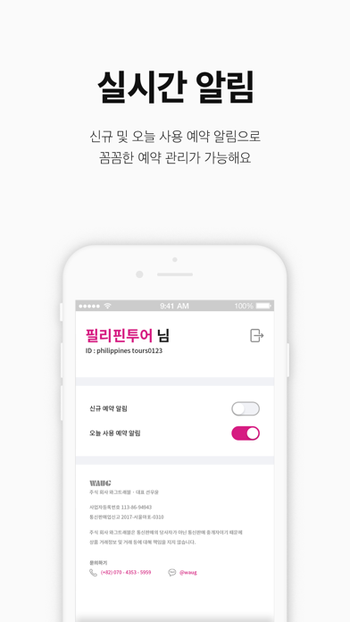 LESS EFFORTS, MORE BOOKINGS! 소중한 나의 여행 상품을 더 쉽고 편하게 관리할 수 있습니다. LESS EFFORTS, MORE BOOKINGS! : · 와그 파트너앱은 가장 효율적으로 나의 액티비티(상품)이 와그 서비스에서 얼마나 많이 판매가 되고 있는지 실시간으로 확인할 수 있는 파트너 전용 앱 서비스입니다. 이제 복잡하고 귀찮게 관리자 사이트를 방문하지 않고 모바일로 모든 상품과 예약리스트를 관리하고 직접 예약 컨펌을 할 수 있습니다. 또한 이를 통해 여행을 떠나는 사람들이 더욱 빠르고 편하게 여행을 즐길 수 있도록 WAUG|Partner가 함께 도울 수 있습니다. 와그 파트너가 필요한 이유 : · 실시간 푸쉬 메시지를 통해 예약을 컨펌하고 더 많은 고객을 유치할 수 있습니다. · 날짜별로 몇 명의 고객이 이용하는지, 내일은 얼마나 많은 사람이 방문하는지 체크할 수 있습니다. · 이제 쉽고 편하게 나의 인벤토리를 관리해보세요. WAUG|Partner : 와그 x 파트너는 기존의 여행 예약 경험을 가장 혁신적으로 개선하고 모든 여행자가 더 쉽고 재미있게 즐길 수 있도록 돕는 것이 목표입니다. 개발 문의사항 : · 이메일 : [email protected] · 문의전화 : 070 - 4353 - 5959 · 카카오톡 : @waug