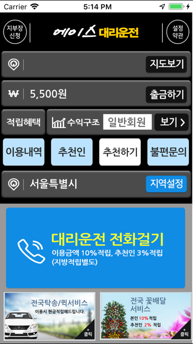 에이스 대리운전"은 대리운전 뿐만 아니라 꽃배달,탁송,퀵서비스를 함께 이용하면서 적립금을 받을수 있는 대리운전 어플(APP)입니다. * 본인이용시 10%적립,추천인이 사용시 마다 계속 3%추가 적립해 드립니다. * 10명이상 추천시에는 별도의 추가적립이 있습니다. * 고객님께 최선을 다하는 최고의 "에이스 대리운전"이 되겠습니다..^^
