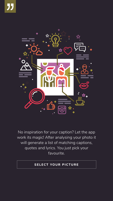 Struggling to come up with inspiring captions for IG pictures? Let the app 'Smart captions for IG pictures' analyse your photo using latest computer vision technology to provide you with a list of matching and funny captions, quotes from celebs and movies, music lyrics and jokes. The app will detect objects in your IG picture and come up with a list of inspiring and funny IG captions. You only have to pick your favourite quote. Simply copy-paste it to your social media post and let the likes and comments flow in on Instagram or Facebook! Start using 'Smart captions for IG pictures' 1. Select the picture you want to post on IG from your device 2. In a few seconds the app will analyse the content of your photo and come up with a collection of matching tags 3. You are provided with a list of inspiring captions and quotes relevant to your picture 4. Copy and paste your favourite IG caption and you are ready to post your picture! 5. Attract more likes and followers on your social media channels Caption categories More than 10.000 cool captions for IG pictures of different categories are included in the app: quotes of famous people and movies, lyrics of songs, ‘did you know’s’ and other facts, funny jokes and trending phrases. This collection of captions is organised in different categories like: home, beauty, art, love, knowledge, happiness, politics, money, dreams, business, peace, sports, life, food, friendship, work and health. The captions are added and updated on a daily basis. How it works Using computer vision technology and machine learning, the app is able to extract, predict and understand the visual content of your social media photo. After a so-called image classification process, it will show you the resulting list of detected category labels and tags. This image recognition technique can identify and detect more than thousands of different objects and scenes in your IG picture, like animals, vehicles, plants, buildings, etc.