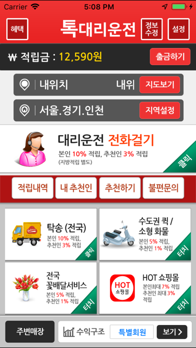 1.스마트한 소비~ 톡대리운전이면 됩니다. 2. 대리운전,탁송,퀵,꽃배달을 이용하실때마다 적립금을 드리고 있으며 추천인제도를 통해 추천인이 이용하셔도 적립금을 드리고 있습니다. 3. 당연히 추천인이 많으면 많을수록 적립금은 쭉쭉~~ 4. 최고의 서비스로 모시겠습니다.