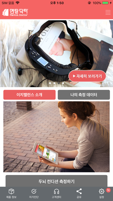 오늘 나에게 가장 스트레스로 다가온 일이 무엇이었나요? 자신이 받고 있는 스트레스는 어떤 것일까요? 이지밸런스의 뇌파 분석 결과를 통해 멘탈닥터 맞춤 솔루션을 제공받아 보세요. ◈ 멘탈닥터 이지밸런스 소개 이지 밸런스는 2CH 방식의 EEG건식 전극(좌,우)이 쿠션 부분에 부착되어 있어, 이마에 착용하고, 뇌파를 측정하여 측정한 뇌파 분석 결과에 따라 나레이션과 수평안구운동(EMDR) 실시하여 뇌파의 변화 상태를 스마트폰 어플에서 직접 확인함으로써,제품의 신뢰도를 향상 시킬수 있도록 개발된 멘탈 케어 솔루션 시스템입니다. ◈멘탈닥터 이지밸런스 사용방법 ① 사용자의 정신건강 상태를 측정하면 측정 결과값이 블루투스 통신을 통해 모바일이나 태블릿을 통해 확인합니다. ② 결과값에 따라 사용자는 적절한 심리학적 기반 콘텐츠 카데고를 추천받아 감정조절 향상에 탁월한 안구운동(EMDR)을 20~30분정도 사용합니다. ③ 일정시간 솔루션을 처방받아 사용후. 사용 전 사용 후의 데이터를 비교할 수 있습니다. ◈ 멘탈닥터 이지밸런스 장점 - 최초의 정신건강 증진 토탈 플랫폼입니다.(측정 -> 분석 -> 솔루션) - 공간의 제약없이 감정장애 발생시 응급조치가 바로 가능합니다. - 학습이 필요했던 뇌파 분석을 쉽게 그래프로 쉽게 보여줍니다. - 사용자의 뇌파 측정 분석 결과에 맞는 맞춤 콘텐츠 솔루션을 제공합니다. - 클라우드 서버에 저장되어 지속적인 관리를 할 수 있습니다. - 뇌파측정 데이터를 전송하여 전문가의 상담을 받아볼수 있습니다. ◈ 멘탈닥터 이지밸런스 솔루션 -안구운동EMDR 착용전 두 개의 파란 불빛을 하나로 모아 좌우로 움직이는 수평안구운동(EMDR)입니다. 눈과 뇌는 아주 밀접하게 연결이 되어 있어 눈동자를 좌우로 굴리는 것 자체가 뇌가 운동하고 활성화 될 수 있는 가장 빠른방법이며, 수평안구운동(EMDR)은 부정적인 생각을 정보처리 하는데 탁월한 효과가 있습니다. -감정상태별 맞춤 콘텐츠 멘탈닥터 콘텐츠는 심리전문가가 오랜 기간에 걸쳐 연구개발하고 심리전문가가 직접 참여하여 개발된 심리학 기법 감정 코칭 콘텐츠입니다. 분석 결과 에 따른 뇌파 신호 구간에 따라 맞춤형 콘텐츠를 추천합니다.