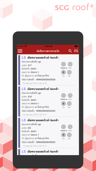 SCG Roof Plus feature - Open,Update and Approve Jobs. - Check-in for Manpower and Place Environment. - Sefety observation check(SOC). - Work progress check. - Work dairy report. - Work dairy Approve.