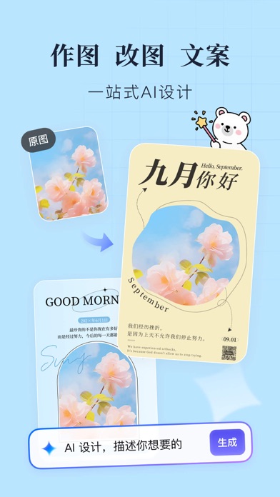 【创客贴设计】超一亿用户作图的选择! 只需改图换字,即可完成各类视觉图片设计! 无论是海报,ppt,各类封面,还是运营/营销周边物料,都能轻松搞定。 丰富的图片,字体,贴纸等版权图片素材库,为您的营销物料保驾护航,版权无忧。 创客贴设计 - 让设计触手可得,让设计更高效! 【丰富模板素材,一键套用】 超100w+精美设计模板,8000w+高清图片,15w+原创插画及素材,上千款可商用字体无限畅用。 「精美模板」海报、长图、日签、喜报/战报、公众号首图、小红书封面、简历、名片、邀请函,电商海报、直播间素材、手抄报、LOGO、壁纸、头像、朋友圈、传单、宣传册、易拉宝等200+场景。无论是企业营销、活动展览、电商引流、行政办公还是自媒体创作,都能轻松满足需求。 【AI工具助力,设计更轻松】 AI创作2.0:一句话描述,秒出惊艳设计稿!支持改图生图生设计! 智能设计:输入一句话,AI自动生成宣传海报图片设计; 智能抠图:一键去除主体背景,轻松换背景、描边、加阴影; AI商品图:上传产品照片,AI生成海量场景图,一键搞定商品主图设计; AI海报:输入文案,批量生成海报设计,自动排版,支持再次编辑,大大提高生产效率; 图片编辑2.0:预设尺寸智能裁剪、新建画布、图片加字、换背景、加文字、AI涂鸦等; 图片变清晰:模糊图片一键变清晰,超清画质,焕发图片新活力; AI消除:一键消除杂物,人物,水印等,不留痕迹不伤图; AI拼图:多种拼图方式,智能拼接,碎片成画; 文生素材:输入文字,生成素材; AI文案:智能写作好帮手,爆款文案,一键生成 AI 直达印刷:线上设计到线下实物,一键搞定! 【创客贴企业版】 专为企业内容生产而打造,解决企业设计费用昂贵,制作周期长及版权等问题,同时提供企业内容资产管理平台,让内容资产流转更高效,还有团队协作,审批等功能,规范品牌管控,提升企业营销效率! 【覆盖行业】 教育培训、餐饮美食、金融理财、IT互联网、地产家居、酒店旅游,电商微商,美容美妆、休闲娱乐,新媒体人...全行业模板素材覆盖,市场推广、借势营销、热点追踪、求职招聘、职场办公...打造亮眼设计不再是难题。 【印刷物料】 丰富的宣传单、展架、易拉宝、企业宣传册等印刷设计模板,支持在线编辑修改后,一键下单印刷制作,还有专业设计团队满足个性设计需求,获客引流不用愁! 【会员自动订阅说明】 标准版(个人) 连续包季(3个月):¥69 --付款:用户确认购买并付款后记入iTunes 账户 --续订:苹果iTunes账户会在到期前24小时内扣费,扣费成功后会员顺延一个订阅周期 --取消订阅:如需取消续订,请在当前订阅周期到期前24小时以内关闭自动续费,打开手机【设置】,进入【iTunes Store与 App Store】,点击【Apple ID],选择查看【Apple ID】,进入【账户设置】,点击【订阅】,选择创客贴设计取消订阅即可。 --[自动续费条款]:https://m.chuangkit.com/pages/webs/index?t=2 --[会员协议]:https://m.chuangkit.com/pages/webs/index?†=2 --[隐私条款]:https://m.chuangkit.com/pages/webs/index?t=1 ............................................... 公众号:创客贴设计 官方网站:https://www.chuangkit.com 反馈邮箱: [email protected] 设计不求人,AI助你0基础完成专业设计——创客贴