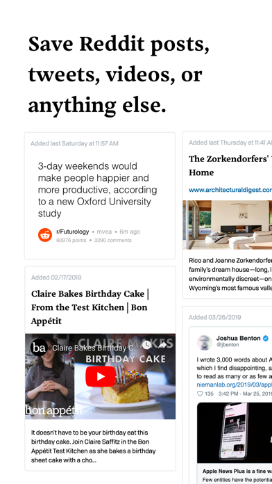 *Save any link, from any app.* Use the bettermark Share Extension in apps like Safari, Twitter, Instagram (and more!) to save any link for later. *Browse what you've saved at a glance.* Each link you save becomes a fully searchable card. Instead of a link to YouTube, watch a video you've saved right from your bettermark inbox. *Find what you've saved in seconds.* Instant search lets you find something you saved months ago, in seconds.