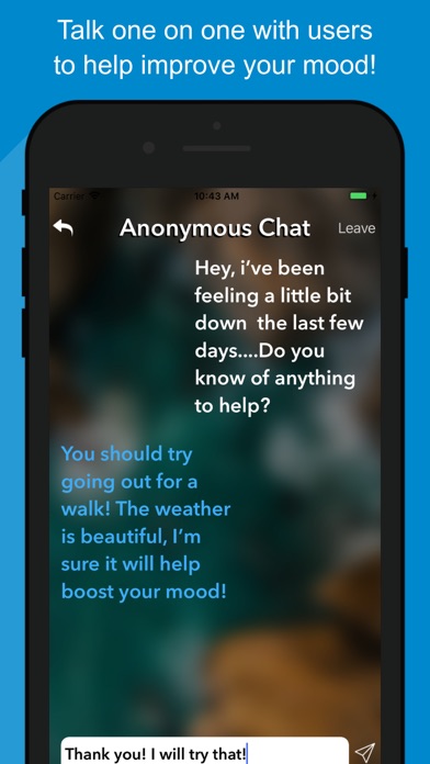 Have you ever wanted an easy yet trusting way to visually track your emotions every day? Big mood is pact full of many amazing features to help you! Features: ▶ Get custom articles and videos based on how you're feeling ▶ Save articles and videos to return to at any point ▶ Track your moods in a visual graph ▶ A daily journal where you get a new page to write in everyday ▶ Anonymous chat with other users to help relieve your moods ▶ Instant hotlines to many organizations that can help you When you open Big Mood you will first be greeted with an option to choose what mood you are in. If your mood is of a concerning nature, instant and easy options for help will pop up. This app is packed with relaxing, mood boosting, nice music videos to watch and articles to read to help. Another option is to speak with another anonymous user about the issue at hand and to relieve that mood with the anonymous user. If that doesn’t work, there are helplines that you can also call. Feel relaxed, happy, and relieved with Big Mood!