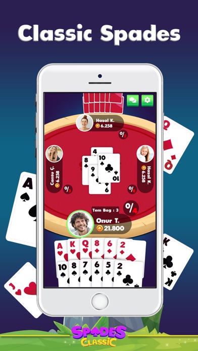 CHALLENGE YOUR OPPONENTS, SMASH THEM IN SPADES CLASSIC! Spades Classic app is now available on App Store for your Apple devices, you can download SPADES CLASSIC ONLINE for FREE and play this extraordinary mobile spades game everywhere and anytime you want. If you enjoy playing popular board games like Spades, Euchre, Hearts, Solitaire, Kings, Spit, Gin Rummy and Canastra; Spades Classic is definitely what you are looking for! Forget all kind of spades games you have ever known. Get ready to play the most unique Spades Card Game ever! If you do not know how to play Spades Classic, do not worry. You can start with tutorial for beginners & challenge the AI until get ready for real online battle! Install now and feel the joy! HOW TO PLAY? Spades Classic is played with 4 players using standard 52 cards deck. Spades are always trump and the most important cards. Aim of game is to guess the score you will get at the end of game and try to block your opponents to achieve their bid. Earn higher score than your opponents and win the game! Become one of the best spades players and carry yourself up to the leaderboard! THE REAL BATTLE | CHALLENGE AND WIN * Get ready to challenge Spades experts all around the world. * Match with better players as you win more games. * Become the genuine master of Spades in this competitive environment. SPLENDID VISUALITY * Best visual experience with full HD graphics. * Enjoy high quality animations. * Multitouch support is enabled. LIVE GAMEPLAY | ONLINE MULTIPLAYER * Play against similar level real opponents. * Unlock new achievements and prove your skills! FASTEST SPADES CARD GAME EVER * Easy to match, quick to play! * Are you a newbie yet? Do not worry! You can play offline against Artificial Intelligence as well. FREE COINS | DAILY REWARDS * Earn free chips by watching rewarded ads. * Login with your Facebook Account, earn more chips as a welcome gift. * Login everyday to earn more rewards. SOCIALIZE & MEET NEW PEOPLE * Chat with your opponents! * Express your feelings using emojis! For further questions, please contact us from [email protected] email adress.