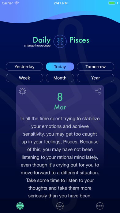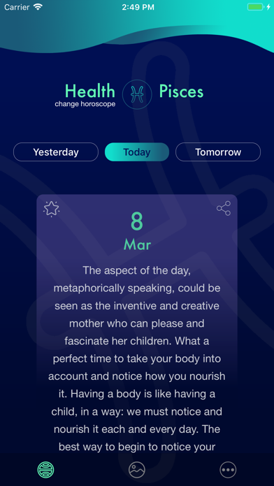 The Daily Horoscope for Pisces is a free horoscope application updated on a daily basis with the best daily horoscopes. FEATURES: • Daily horoscope • Love horoscope • Health horoscope • Career horoscope • Sign matches for love, friendship and career • Daily notifications on horoscope updates Get your daily horoscope every day on the go through intuitive and user friendly interface. With Daily Horoscope for Pisces, your daily horoscope is just one click away! Also, get high-quality amazing astrology backgrounds for your screen and be individual! All images in the app are provided for entertainment and informational purpose only and may be removed at anytime following a copyright removal request. All images collected from open source databases.