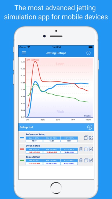 This is the most advanced carburetion simulation application on the market for Dellorto VHSH30 carburetor engines. It allows you to create carburations with all the information about the type of engine, track, weather conditions and carb setup (jets, needles, air screw, ...) making for each of them a simulation that allows you to compare them, choose a carburetion as a reference to be able to adapt it in each situation, take notes, check how each change in carburetion affects, etc. In addition, it offers carburetion recommendations for the following engines: - TM K9, K9B, K9C, KZ10, KZ10B, KZ10C and KZ-R1. - Modena KK1, KK1R, MKZ and KK2. - Vortex RVS, RVX, RVXX, RVZ, RKZ, RSZ and RTZ - Maxter MXO, MXV, MXE, MXS, MXS2. - IAME Screamer, Screamer 2, Screamer 3 and Shifter. The application consists of several screens and features: - Simulation main screen: it shows the graph and the values of the configured carburations. One of the carburations will be marked as a reference to make comparisons on this configuration. For each carburetion you can edit its values or create new ones. - Setup creation or edition screens: when creating or selecting a carburetion on the main screen the user is guided by a set of screens on which he can provide information about the engine (brand, model, fuel density, % oil mixture), carburetor configuration (high, low, diffusers, needle, air screw, jets, etc.), weather conditions (temperature, humidity, altitude, pressure... that can be picked up automatically), and the track (name, length, lap time, maximum speed, etc.). - A functionality to collect the weather conditions of the nearest weather station: get the temperature, atmospheric pressure, humidity, altitude, air density, altitude by density and more values. - Help on each screen, preferences to modify the language, appearance or available parts, etc. The application has been tested by international racing teams, but can be used by anyone to optimize their engine.