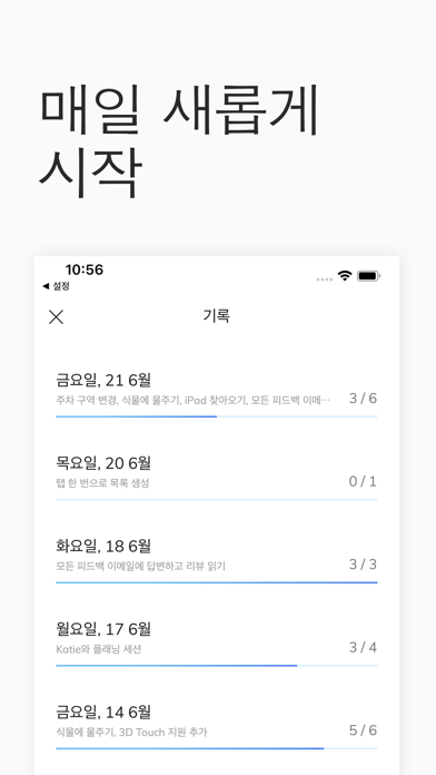 오늘은 무엇을 완료하고 싶으세요? 오랫동안 나눴던 이메일에 답변을 하실래요? 아니면 쓰레기를 버리는 걸 기억하실래요(이것도 멋져요). 저희가 이러한 일들에 대한 목록을 모두 써드립니다. Daylist와 함께 더 편안하게 체크하세요. Daylist를 어떻게 사용하나요? 1. 탭 한번으로 오늘의 목록을 만드세요. 식료품 쇼핑, 업무 목록 또는 그 밖에 모든 것들로요. 2. 완료하려는 작업을 써보세요. 3. 작업 알림을 받고 싶으세요? 탭만 하면 돼요. 4. 작업을 완료하면, 앱에서 완료시켜보세요. 이 단계가 정말 마음에 들 거예요. 매일 새롭게 시작하세요. 장기간 목록을 관리할 필요가 없어요. 바로 그거예요. 더도 덜도 필요한 게 없어요. 미니멀하고 편안한 목록을 매일 확인하세요. 가입 또는 스팸 없음 앱을 바로 사용할 수 있어요. 당신의 이메일이나 다른 정보가 필요하지 않아요. 그리고, 앱에 입력하는 모든 데이터는 아무도 모르게 처리합니다. 개인정보는 정말 중요해요! 구독 없음 일주일 동안 앱을 사용해 보세요. 앱이 마음에 들면, 한 번의 구매로 영원히 사용하세요. 광고도 없습니다. 지금 구매할 생각이 없다면, 그냥 사용하세요. 이 앱은 글로 설명하는 것보다 더 멋진 할 일 목록을 제공합니다.