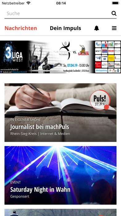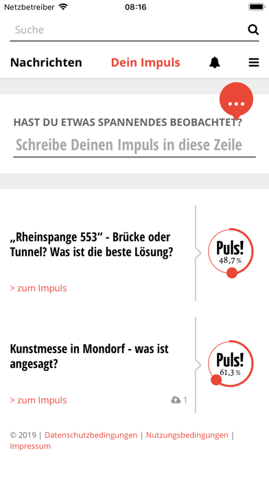 machPuls bringt Dir die Nachrichten aus Niederkassel und Umgebung, die Dich wirklich interessieren – kostenlos! Dabei kannst du machPuls aktiv gestalten und mitentscheiden, worüber wir berichten. Bei machPuls beginnt alles mit Dir. Wir setzen Dir nicht einfach irgendein Thema oder irgendeinen Text vor – wir wollen von Dir wissen, was Dich beschäftigt, was für Dich faszinierend oder interessant ist. Wir laden Dich ein, mitzumachen. Dafür brauchen wir deinen „Impuls“. Impulse sind Themenvorschläge: Immer, wenn Du etwas Spannendes in deiner Umgebung beobachtest, Dich etwas beschäftigt oder dir eine Frage unter den Nägeln brennt, dann kannst Du mit nur einem Klick einen Impuls einstellen und Bilder, Kommentare, Meinungen hinzufügen. Mit der machPuls App einfacher denn je, von jedem Ort zu jeder Zeit. Alle Leser können anschließend für Deine Idee voten, indem sie auf den Puls! - Button klicken. Wir nehmen Vorschläge auf und unsere professionellen Journalisten erstellen einen Artikel. Dieser erscheint schließlich auf der Startseite. Dort kann dann jeder Dein Thema lesen und auch kommentieren. Mit der machPuls App erhältst Du zudem Eilmeldungen und Hinweise auf besonders wichtige oder relevante Texte per „Push-Nachricht“. Damit bist du stets informiert, was in Niederkassel passiert. Außerdem erfährst du mit der App sofort, wenn dein Impuls zu einem Artikel ausgearbeitet wird, von dir zur Verfügung gestelltes Material genutzt wird, Fragen und Meinungen zu deinem Impuls gepostet wurden, oder ein neuer Artikel in Deinem Interessensgebiet veröffentlicht wurde. Deine Stadt. Deine App. Dein Puls!.