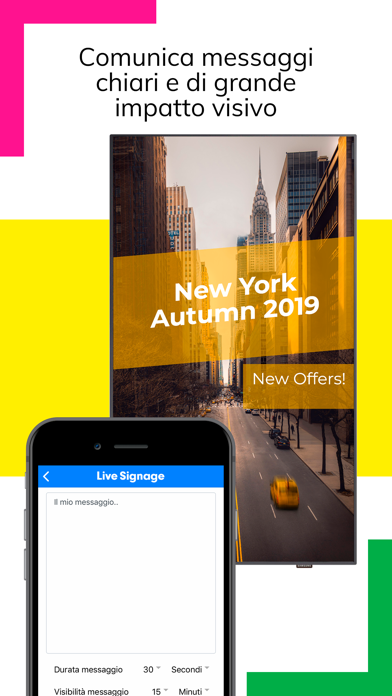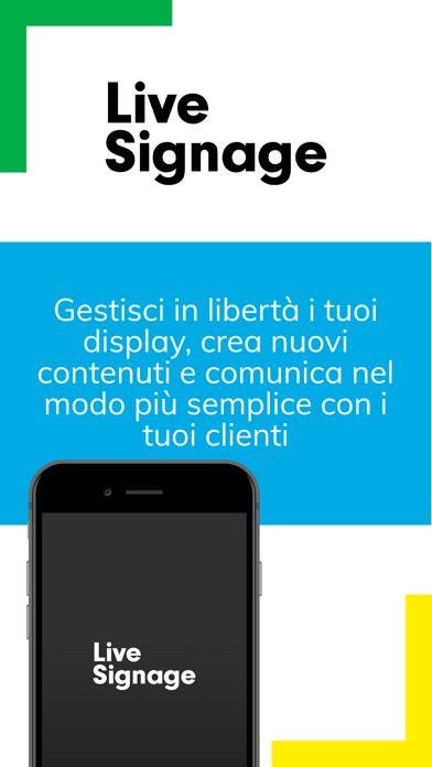 Il digital signage più semplice ed innovativo del pianeta. Comunica messaggi chiari e di grande impatto visivo, cattura l’attenzione del cliente e guidalo verso l’acquisto. Visualizza in modo innovativo qualsiasi tipo di contenuto, informa in real time e pubblica foto, video e mappe. Informa, ispira e massimizza l’attenzione per vendere raggiungendo il cliente su tutti i media: schermo, smartphone e web! Guadagna con il tuo monitor: vendi senza sforzi spazi pubblicitari su Live Signage in Italia e nel mondo. Da oggi con la nuova Mobile App puoi gestire Live Signage direttamente dal tuo smartphone, senza alcuno sforzo aggiuntivo.