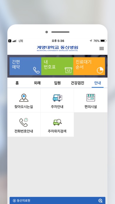 계명대학교 동산병원을 편리하게 이용할 수 있는 모바일 어플리케이션 입니다 설치하시면 계명대학교 동산병원에서 아래와 같은 다양한 서비스를 받으실 수 있습니다. -내 일정 병원에서의 진료일정을 한번에 보실 수 있습니다. 진료와 관련된 단계별 설명을 볼 수 있어요 -진료예약 모바일앱에서 진료예약을 간편하게 할 수 있습니다. 예약내역도 조회할 수 있어요 -모바일결제 진료비 수납을 모바일에서 편리하게 결제 할 수 있습니다. -진료대기순서 진료대기순서를 어디에서든 확인할 수 있습니다. 진료실 앞이 아니라 커피숍에서 기다리셔도 돼요 -진료이력 병원에서 진료 본 내역을 간편하게 확인할 수 있습니다 외래, 입원 모두 확인 가능해요 -처방약조회 병원에서 처방 받은 약을 한눈에 확인할 수 있습니다 환자경험과 관련한 서비스가 계속 추가될 예정입니다.