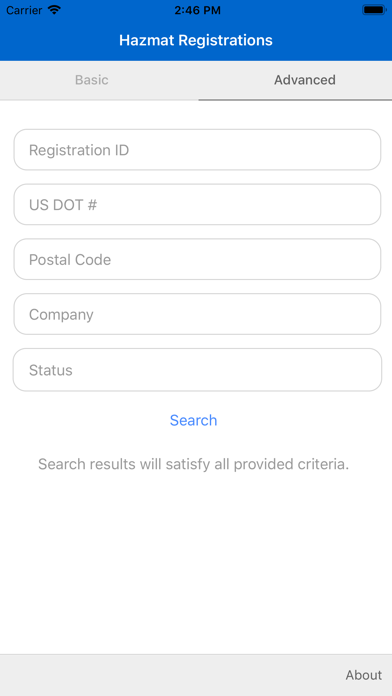 The Hazmat Registration Search mobile app allows you to search the US Department of Transportation’s Hazmat Registration database to determine the status of a company’s hazmat registration. Basic and advanced search functions allow you to search using registration ID, USDOT #, postal code and/or company name. The basic search function provides one field to enter a search value and can return a list of many results. The advanced search function provides multiple fields to enter search values and can return a shorter refined list of results. Once a search is performed, a list of companies is returned. By selecting a company, you can expand the details of a specific hazmat registration record. A PDF function allows you to generate a PDF version of the Hazmat Registration certificate that can be printed, saved or emailed. The web based version of this application can be accessed at https://portal.phmsa.dot.gov/HazmatRegistrationSearch.