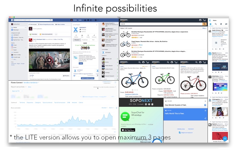 Save Time with Fleet. Experience the satisfaction of having Total Control. Watch it in action on SOPONEXT.com. (direct link https://youtu.be/ZgDDfi7P5sM) With Fleet you can control and compare multiple web pages at the same time without wasting time or space. You don't need to select a page, or refresh it. It's all in front of you, and web pages self-refresh. And now, If you need, they can scroll simultaneously. Arrange your best configuration today. The Power of Fleet: ● Exclusive Page Arrangement System with Splitting feature and Resizable Edges. ● Magic Command Bar that appares\disappares pressing one key: Alt. ● Automatic Refresh with Customizable Time Interval. ● Customizable Page Layout Zoom. ● Mobile/Desktop Switch. ● Simultaneous Scrolling available! (Thanks to the Eugene feedback) ● Drag&Drop Links from Page to Page. (useful for divide the engine results) ● FullWindow Mode (for a single page quick look) ● Pages order Swappable. ● Automatic Filling Fields Supported. ● No Edit mode needed, you can use and edit anything at the same time. ● Little ADBlocker. ● Very thin window title bar to save pace. ● Refresh All Pages Command. Other reasons why you will love it: ● Option: Start new pages in Mobile. ● Option: Open Tab-Link in Default Browser. ● Option: Open All Link in Default Browser. ● Customizable Dividers Color. ● Customizable Dividers Thickness. ● Back/Forward Gesture for Mouse/Trackpad. ● Clean: no borders, no tall static bars. ● Common browser items, like: back, forward, reload, home, search/address bar. ● FullScreen Mode supported. ● SpletScreen Mode supported. (very useful to put Fleet near your default Browser) ● History and related clear button supported. ● Configuration Auto Savable. ● Upload supported. ● Download supported. ● Selectable Search Engine. ● Customizable Home Page. ● Full Keyboard shortcuts support. (Hold Alt to show the All-Pages commands) ● Web Inspector (for web developers - right click on the page). ● Low RAM usage. ● Only 2.0MB required. How to arrange: The system is based on the space splitting. Every page space can be splitted in 2, through 2 buttons: Split Vertically & Split Horizontally. With this simple system you can create INFINITE POSSIBILITIES. Remember: -Using the actions on the menu "Page", they will impact on the page pointed by the cursor, alternatively on the last focused page. -Fleet is a friend of your default browser, it doesn't replace it. They can work together. -Some websites use a responsive layout, it means that they change interface when you resize the page. So they don't change interface when you switch between Mobile Mode and Desktop Mode. -The refresh time is set on purpose as 20% longer or shorter than the set timing (example: 100 seconds could become 80 or 120). This system prevents websites from blocking your IP. -Obviously, no extension are available, but we have developed a little ADBlocker. Why only surfing the web when you can navigate on it with a Fleet? Start today to Save Time. Create your perfect Arrangement! Version with limitations. Please, leave 5 stars and a positive feedback if you like our app. But support us reporting suggestions or bugs to: [email protected]. Enjoy. -SOPONEXT