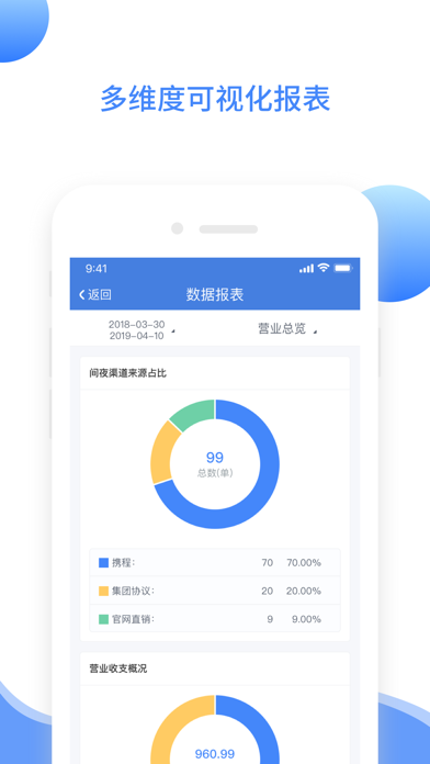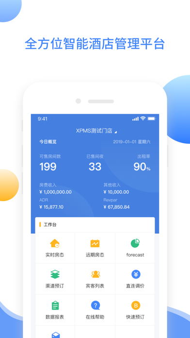 多店管理:同一账号管理一家或多家酒店,轻松切换 前台管理:满足多场景酒店经营需求,实时客房状态展示(如在住、预到、空房等)支持新增预订、置脏、置净、置维修、锁房等操作 远期房态:支持查看门店房间在未来日期的状态展示 数据报表:支持营业总览和部分报表展示 渠道管理:强大的直连渠道管理模块,价格、库存一键调整,全渠道覆盖 订单管理:支持查询门店订单和查看订单详情 帮助中心:提供强大的酒店运营课程和系统操作指导 消息中心:支持门店消息通知(订单动态、价格监控、提醒)