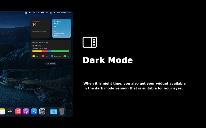 See your total RAM usage at a glance. Now you can see your total memory usage in the application and also as a today widget in your notification panel. It is very easy to use, and with one single click, you can optimize the memory. Build for MacBook, MacBook Air, MacBook Pro, iMac, iMac Pro, Mac Pro, and Mac mini. And it is the ideal tool for Graphic artists, Video editors, Architects, Programmers, and Scientists to know how much memory is available on his Mac computer. Mac App features: ◆ See your total memory use in GB and percent ◆ Get the currently active, wired, compressed memory use values ◆ Warn when the memory is higher than the regular use ◆ Overview of your active applications in your memory ◆ Optional Memory meter (static, process bar, and percentage value) in the Apple menu bar ◆ Option to pin the window on top of your desktop ◆ Notification widget ◆ Support for Dark Mode The following high-quality widgets are available in this widget bundle: ◆ Shows the progress bar and the label for free, used, and total capacity (in small, medium size) ◆ Detailed Usage of your current memory with the device name on top (in small, medium, large size) ◆ Shows the colorful progress bar with the type of memory such as Active, Wired, Compressed, and Free (in small, medium, large size) ◆ Percentage Usage of your current memory usage in the larger font size (in small, medium size) This is built by the developer of the most popular browser extension Turn Off the Lights. To learn more go to https://www.stefanvd.net