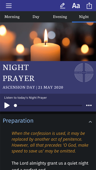 Join in Thy Kingdom Come by listening to - and making your own - this pattern of prayer and Bible reading from the Church of England. The services in this app form part of what is sometimes known as the ‘Daily Office’, a form of worship and prayer which can be used by individuals or in groups. They are drawn from the Church of England's Common Worship library of services and prayers. You are invited to use Daily Prayer for Thy Kingdom Come to establish a spiritual rhythm which will nourish your heart and keep prayer on your lips, enabling you to become part of a global wave of prayer. That rhythm might take the form of saying both Morning Prayer and Evening Prayer. Or you might start with just Prayer During the Day – suitable for any time of day – followed, perhaps, by Night Prayer. For each of the eleven days between Ascension Day and Pentecost, the app offers you: • Eleven days of Morning and Evening Prayer, plus the simpler and shorter Prayer During the Day and beautiful and simple Night Prayer. • Full audio of each service. The app includes c. 8 hours of specially recorded audio of all 44 services included in the app, with a mixture of speech and singing. Tap the play icon to start or pause the audio, and skip forward or backwards through the service using by tapping the three dot symbol to the right. • Edit Mode. You can also use the 'pencil' icon to enter 'Edit Mode' and make choices about the psalms, prayers and readings in each service. • Adjustable settings and timings. Use Settings to adjust the time of day the app shifts from Morning to Day, Day to Evening and Evening to Night. And you can set reminders for one or more of the services to help you establish and maintain a rhythm of prayer throughout your day. • A beautiful, accessible design. As well as mirroring the acclaimed design of the booklet, the app offers adjustable text sizes and Night Mode to make it easy to read and follow whenever you choose to pray. The Daily Prayer for Thy Kingdom Come app has been developed by the team behind 2018’s award-winning #LiveLent app (Church of England, Church House Publishing and Aimer Media Ltd). It is based on the Common Worship Daily Prayer for Thy Kingdom Come booklet, produced in collaboration with the Thy Kingdom Come team. Privacy policy and terms: https://www.chpublishing.co.uk/privacy