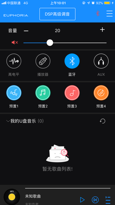 一个便捷专业的调音APP,支持4.0蓝牙,内置6种音效模式,31段EQ调节。让您有不一样的听觉享受。播放器界面,支持U盘播放。