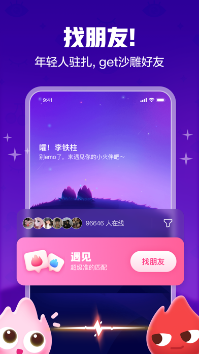 要 素 察 觉——「火花」已牢牢掌握00后年轻人的热梗密码! 你的网是不是看乒乓球直播比别人慢了3个球?山顶洞人来「火花」小住一段时间摇身变成12g冲浪用户,犹豫就会败北!友友们,欢迎入驻火花!二次元三次元各种次元,大家一起玩~ 「火花」是一款年轻人聚集的社交软件,深受00后喜爱,尤其是中学生和大学生。火花,遇见好玩的人,轻松表达自我观点。具有相同爱好的用户在这里进行一对一聊天、斗图、展示自己的精彩生活, 来认识新朋友吧~ 特色功能: 【在线遇见】年轻沙雕的小火伴们都在这里聚集,无聊的日子一天又一天,找到志同道合的小火伴刻不容缓!在这里有一个有趣的人,等着与你遇见。 【缤纷世界】这里是年轻人的潮流文化娱乐广场,小火柴们在这里分享日常,夜里emo,白天满满正能量!我们可以看到同龄人鲜活精彩的生活,火花,让你贴近年轻人~ 【趣味聊天】在这里,我们尽情展示废话文学,我们阴阳怪气,我们沙雕玩梗;我们又暖心聊天,互相取暖。我们在这里轰轰烈烈斗图,奇怪的表情包增加了一波又一波…轻松的玩法帮你敲开聊天之门! 【安全守护】有聊天的地方就有火花小卫士,在这里,温暖与礼仪并存,我们对骚扰严格说“不”!火花小卫士将守卫你的每一次聊天。 推荐在这些场景使用: 你是否在刷完购物软件、小说软件后依旧无聊,找不到事情可以消磨时间? 是不是游戏下线后、看完喜欢的影视剧后找不到同好可以交流? 在你无聊的时候,火花上有着同样无聊却饱有聊天欲的小火伴! 让我们擦亮火花,在这里遇见有趣好玩的人吧! 意见与建议欢迎联系: 官方QQ:2703912502 APP内:个人主页-「设置」-「问题和反馈」告诉小助手