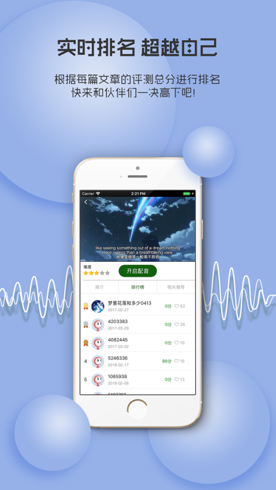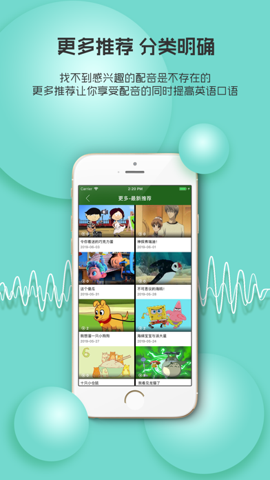 “英语配音秀”是一款轻松趣味又高效的英语口语学习软件,每日更新最新最热的英语经典视频,通过为电影、动漫等视频 配音,让您“忍不住开口说英语”,不知不觉提高口语,掌握地道标准发音。 1、【玩配音秀口语】听腻了影视剧里的台词,多想加入自己的声音!海量热门经典美剧,电影大片等你来配音,秀口语,做自己的主角!不背单词、不记语法,摆脱一切枯燥无味的英语学习方法,将你的英语提升到母语水平! 2、【丰富的素材】火爆带感的美剧、基情满满的英剧,流行动感的英文歌曲,不断更新的动漫、纪录片、搞笑剧、经典 演讲等视频更是应有尽有! 3、【全新的方式】摆脱枯燥无味传统学习方式,模仿配音,随时随地玩配音,通过配音学习英语、提升英语口语。