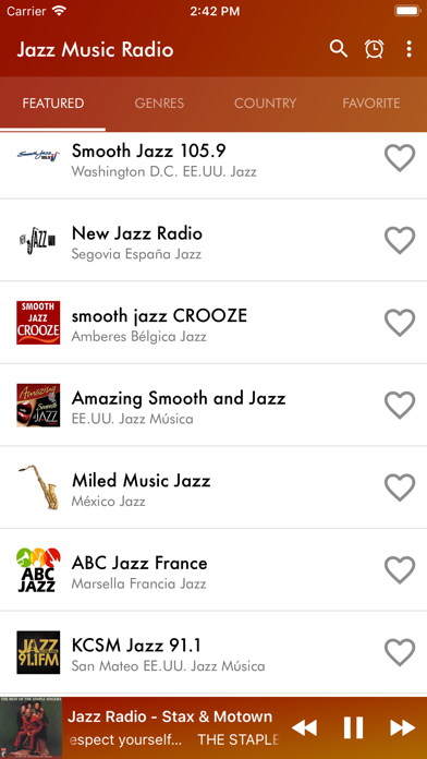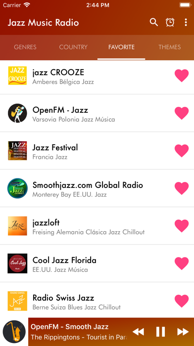 Download and enjoy your Jazz Music Radio With Jazz Music Radios you can easily, quickly and easily listen to your Jazz radios from different countries of the world. Jazz music Radio includes several subgenres such as Hot Jazz, Swing, Bebop, Cool Jazz, Hard Bop, Post-Bop, Free Jazz, Smooth Jazz, Acid Jazz, Jazz Soul, Dixieland, New Orleans Jazz, Traditional Jazz, Funky Jazz, Jazz improvisation, Gospel Jazz, Soft jazz music, Jazz Rock, Jazz flamenco, acid jazz, New age jazz, contemporary jazz and electronic jazz with jazz drum beats, all genres in a single jazz radio app. Characteristics of Jazz Music Radios: - Modern and elegant interface. - Favorites option - Timer (automatic shutdown) - Variety of Themes to customize your application Smooth Jazz Music gives you the best experience when listening to your Christian music. Easy-to-use interface, with just one button you can add to your favorites list. You can find your Smooth Jazz Music in seconds, putting the name of radio jazz in the "search engine" option Download NOW! your Jazz Music Radio