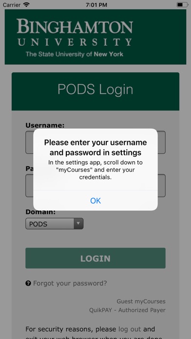 Binghamton U MyCourses auto login. *Enter credentials in the settings app*