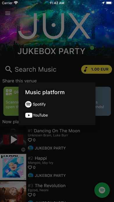 With JUX you can play your favorite tracks in many supported bars, clubs and lounges. Get the party started by playing your favorite tunes at the places you love! See the music videos of the tracks you queue in the venue with JUX TV. Be the DJ and change the playlist live by voting on your favorite tracks. Use JUX at your own parties and make money from your guests' song request!