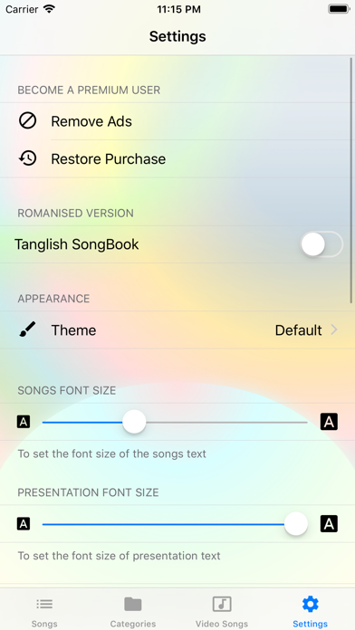 Christian Songbook - Tamil app is an offline electronic version of Tamil Christian songs. Features:- - Offline Tamil Christian Songs Book - 8050 Total songs - 7024 Tamil Songs - 1026 English Songs - 52 Albums - 63 Artists - 29 Categories - 2292 Video Songs - 68 Karaoke Songs - 8050 PPT and PDF songs - Tanglish Version (Romanised version of Tamil Christian Songs) - Stunningly beautiful graphics - Intuitive and easy-to-use interface - Plenty of themes - Favorites - Slide Show option - iPad Support - Remote Slideshow - Video Songs added - Album wise classification / Artist wise classification - Recent Songs - Song search made easy by Unicode Tamil font - Ads can be removed by the one time purchase - Song scale, beat and tempo for some songs - Export any song as PPT - And many more tweaks inside the app Artists Included: -------------------------- 1. Father. S. J. Berchmans 2. Rev. B. E. Samuel 3. Pastor. Paul Thangiah 4. Evangelist S. Gnanasekar 5. S. A. Chandrasekaran 6. Pastor. John Jebaraj 7. Pastor Moses Rajasekar 8. Pastor. K.S.Wilson 9. Bro. Lukas Seakar 10. Sis. Saral Navoriji 11. Rev.Dr.S.Justin Prabakaran 12. Dr. Joseph Aldrin 13. Pastor Sam P. Chelladura 14. Alwin Thomas 15. Premji Ebenezer 16. Reegan Gomez 17. Ranjith Jayapaul 18. RaviBharath 19. Prince Jon 20. Issac Joe 21. Gersson Edinbaro 22. Wesley 23. Agathiyan 24. Rev. G.Thomas Devananthan 25. Asir 26. Augustine Jebakumar 27. Clifford Kumar 28. Daniel Jawahar 29. Darwin Ebenezer 30. David Stewart 31. DGS Dinakaran 32. Emil Jebasingh 33. Ezekiah Francis 34. Freddy Joseph 35. Henry Alfred Krishnapillai 36. Pr.T.K.Arputharaj 37. Jeyaseelan Sebastian 38. Johnsam Joyson 39. Natarajamudaliyar 40. Osborne Jebadurai 41. Prabhu Isaac 42. Bro. Raju 43. Reenukumar 44. Wesley Maxwel 45. Zac Robert 46. Pastor. Selvakumar 47. Cruz Divakaran 48. Pastor. John Bala 49. T G Sekar 50. Jeswin Samuel 51. Christina Beryl Edward 52. J. Isaac 53. Rev.Dr.M.Rajendran 54. Bro.Dr.Anantastira 55. Ambur Johnraj 56. Pr. Stephan Raj 57. Pr. Jeyaseelan 58. Pastor. Dr. Joseph 59. Evg. Haridoss Albums Included: ---------------------------- 1. Jebathotta Jeyageethangal 2. Keerthanaigal 3. Unakkoruvar Irukkiraar 4. Aaradhanai Geethangal 5. Friends Ministry Prayer Band (FMPB) 6. Yuthavin Sengol 7. Appa Pithavae 8. Messia 9. Meedpin Geethangal 10. Eannai Aatkonda Yesu 11. Kirubaiyae Deva Kirubaiyae 12. Levi 13. Yesuvin anathi snegam 14. Idimuzhakka Geethangal 15. Pradhana Aasariyarae 16. Neerae 17. Dhyana padalgal 18. Aarathanai Aaruthal Geethangal 19. Ezhuputhalae Engal Vaanjai 20. Old Songs 21. Seyal Veerar Geethangal 22. En Piriyamae En Yesuvae 23. En Meetpar 24. Nambikai Naayagan 25. Kanmalai 26. Yesu Anbu 27. Vaazhvu Tharubavarae 28. Paamalaigal 29. Appa Madiyilae 30. Pallavigal 31. Neerae En Nambikkai 32. Ezhunthavar 33. Wedding songs 34. Aayathamaa 35. Kattupuravin sattham 36. Gnana paatugal 37. Roeh 38. Jesus Redeems 39. Piragasikum sudargal 40. Puthiya Yerusalem Paadalgal 41. Aavikuriya Ezhupudhal Paadalgal 42. Aaradhanai Geethangal (Old) 43. Anbarin uzhiya paadalgal 44. Ezhumbi Pragasi 45. Udhavidum Nesar 46. Kirubayin Jeyageethangal 47. Paaduven 48. Sheen Worship Band Songs 49. Muzhangal Yutham Jeba Paadalgal 50. Endhan Ullam Yesuvukae Categories Included: --------------------------------- 1. Christmas Songs 2. New Year Songs 3. Marriage Songs 4. Communion Songs 5. Good Friday Songs 6. Resurrection Day Songs 7. Baptism Songs 8. Malayalam Songs 9. Sorrow/Grief Songs 10. Youth Songs 11. Second Coming Songs 12. Morning & Evening Devotion Songs 13. Personal Devotion Songs 14. Offering Songs 15. Promise Songs 16. Blessing Songs 17. Church & House dedication Songs 18. Birthday Songs 19. Prayer Songs 20. Worship Songs 21. Thanksgiving Songs 22. Praising Songs 23. Gospel Songs 24. Telugu Songs 25. Abishega Paadalgal 26. Prasanna Paadalgal