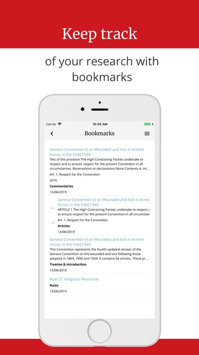 General This application provides offline access to 80 treaties and other documents relating to international humanitarian law (IHL) – most notably, the Geneva Conventions and their Additional Protocols, the ICRC’s original and updated Commentaries on the Conventions and Additional Protocols, and the rules of customary IHL identified by the ICRC’s 2005 Study on customary IHL. The application aims to support the promotion and implementation of IHL worldwide, by providing easy access to IHL treaties and the customary IHL rules in six languages. The ICRC hopes this application can help increase the use of IHL by professionals in their humanitarian dialogue and negotiation, inform the overall law and policy debate, support the teaching and promotion of IHL, and ultimately contribute to strengthening protection for everyone affected by armed conflict. IHL Treaties The section on IHL treaties is divided by topic and States Parties. Each treaty has a home page with an introduction; specific articles can be accessed from this page. The Geneva Conventions and their Additional Protocols are accompanied by the ICRC’s original and updated Commentaries. The various articles of each treaty can be consulted by swiping from right to left and from left to right. Tapping on “About this text” gives users access to general information about a treaty. Tapping on “States Parties” – on the top left of the page – lets users see the list of States party to that treaty, along with the dates of signature and ratification/accession, and the dates of any texts of declaration/reservation. Tapping on the name of a State redirects users to a list of all the treaties in force for that State. By tapping on “States Signatories” – on the top right of the page – users can see the list of States Signatories for each treaty, along with the dates of signature; tapping on the name of a particular State, they can also see all the treaties ratified by it. Customary IHL The section on customary IHL is divided by topic, and then by rule (in English only). Each rule comes with an explanation. Related practice for each rule can be ascertained online by clicking “Related practice” at the top of the page; the user’s device must be connected to the internet to access the “Related practice”. Languages and PDFs The application’s interface can be set in any of the six languages listed in the side menu: Arabic, Chinese, English, French, Russian and Spanish. Specific sections of IHL treaties can be consulted only in English and in French. PDF versions of treaties and documents, and of volume I (rules) of the ICRC’s 2005 Study on customary IHL, can be downloaded in any of the six languages by tapping on the bottom-right icon when in the document. All available PDFs in the user’s device language are automatically downloaded when the application is first installed. Users can also manually download and then delete PDFs in the language of their choice. We recommend installing a separate PDF-reader application to consult PDF texts. Search and Find in page The application has an overall search function. There is also a “Find in page” feature for every document. Bookmarks Users can bookmark documents or parts of documents by tapping on the icon at the bottom of the page. They can organize their bookmarks by moving them up and down in the list, which can be accessed from the homepage or the side menu. Share A “share” button – at the bottom of the page of every document – allows users to share content through email and social media. Feedback Users are encouraged to grade applications on different stores, and to send suggestions or observations to this address: [email protected].