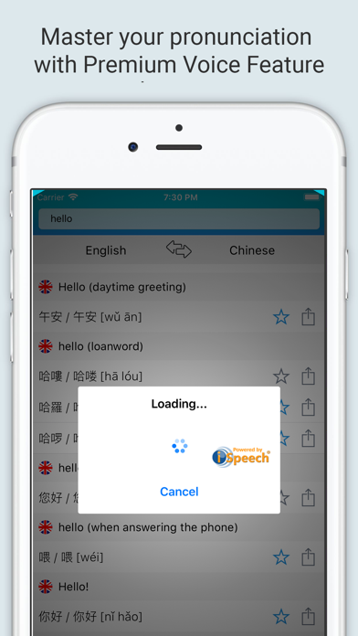 Offline English Chinese Dictionary. Over 50.000 words and expressions! With pronunciation! * More than 50.000 entries * Works offline! No Internet connection needed, the perfect translator for your trips, your studies, or when no data connection is available. * Bookmark your favorite translations for fast reference * Copy the translations to the system clipboard for use in other apps * Instant search