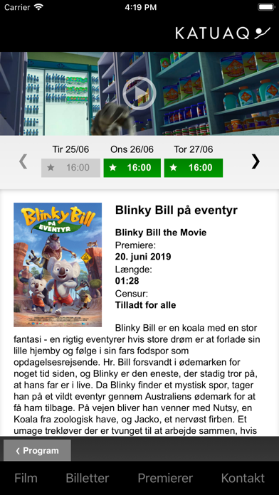Med denne app har du mulighed for at gennemse programmet for Katuaq samt se yderligere filminformationer som trailer, censur, medvirkende skuespillere, varighed m.m. Endvidere giver denne app adgang til billetbestilling og billetkøb med pladsvalg. App’en giver også mulighed for at købe en bestilling, hvis du ikke har mulighed for at afhente den inden tidsfristen udløber. Følgende funktionalitet tilbydes i denne app: - Overblik over film og forestillinger - Køb af billetter - Køb af reserverede billetter. - Reservation af billetter - Se trailere, synopsis m.v. på alle film