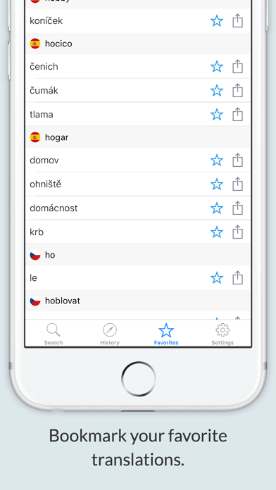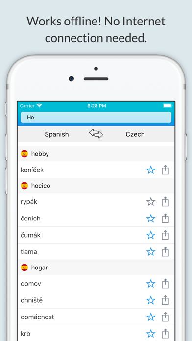 Offline Spanish Czech Dictionary. Over 32.000 words and expressions! With pronunciation! * More than 32.000 entries * Works offline! No Internet connection needed, the perfect translator for your trips, your studies, or when no data connection is available. * Bookmark your favorite translations for fast reference * Copy the translations to the system clipboard for use in other apps * Instant search
