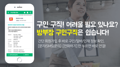 방부장 구인구직은 전국 어디서나 모든 일자리를 한눈에 확인하고 사용할 수 있는 무료 구인구직 서비스입니다. 개인,자영업자,단체,중소기업,대기업 등 누구라도 필요할 때 언제든지 쉽고 빠르게 정규직, 일용직, 알바등을 구인구직 하실 수 있습니다. ■ 간단하고 빠릅니다. 구인자는 사업자등록증 제출,복잡한 채용공고 등록/승인 과정 없이 구직자는 불필요한 이력서,자기소개서 작성 등의 번거로운 절차 없이 바로 활동할 수 있습니다. ■ 남,녀,노,소 누구나 이용할 수 있습니다. 성인 남녀 뿐 아니라 주부,학생,100세 노인도 정규직, 사무직, 전문직 부터 일용직,알바 등 단순한 일자리까지 찾을 수 있습니다. ■ 내가 원하는 정보만 열람하고 실시간 알림 받을 수 있습니다. 직종별, 지역별 구인/인재 정보를 확인할 수 있고, 맞춤정보를 이용하면 내가 원하는 일자리나 인재가 등록되면 실시간으로 알림을 받을 수 있습니다. ■ 이런 분께 추천합니다. -훌륭한 인재가 필요한 모든 기업들의 채용담당자분들! : 대기업,중소기업,공기업,학교,기타 산업체 등 분야 상관없이 사무직/생산직/서비스직/건설일용직/단순직까지 방부장 구인구직에서 필요한 인재를 구할 수 있습니다. - 개인사업 및 자영업 사장님들! : 상시 직원,알바뿐만 아니라 단기 긴급 구인이 가능합니다. - 사업자가 아니더라도 사람이 필요한 분들! : 건설현장,농촌일손,이삿짐일손,택배,배달,세차,매장관리,영업,상담,사무보조,판매,서빙,청소,가사/육아도우미,벌초대행,부업,노인일자리 등등 세상의 모든 일을 다 등록하세요. - 학생,주부, 노인분들! 알바가 필요하신 분들 ! : 최저임금을 보장하는 시간제,일당제 일자리를 방부장 구인구직에서 찾으세요. ■ 이용 시 필요한 권한 방부장 구인구직 서비스 이용 시, 특정 기능에 한해 아래의 권한을 요청합니다. 권한은 허용하지 않아도 서비스 이용은 가능하나, 일부 기능의 사용은 제한됩니다. [필수 접근권한] - 전화 : 구인,구직글 등록자에게 연락할 때 필요한 권한 [선택 접근권한] - 주소록 : 구인,구직글 등록자의 연락처 자동저장에 필요한 권한 - 위치 : 지도에서 현재 위치를 찾기 위해 필요한 권한 - 저장공간(사진/미디어) : 앨범에 저장된 사진 등록 시 필요한 권한 - 카메라 : 카메라로 사진 촬영 후 바로 업로드 시 필요한 권한 ※ 권한 설정방법 : 설정 > 하단으로 스크롤 > 방부장 구인구직 선택 > 접근 권한 관리 ■ 고객센터 -카카오톡 플러스친구 @방부장 -대한민국: 1522-0831 (평일10:00~18:00 토,일,공휴일 제외) -해외: 82-1522-0831
