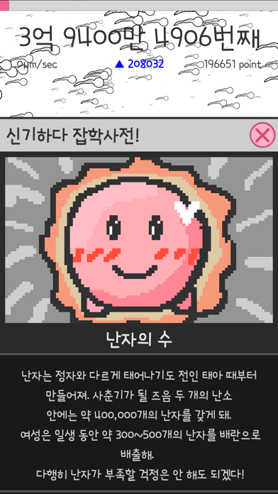 개구리가 올챙이 시절 모른다? 아이가 아기는 어떻게 생기는 거예요? 하고 묻는다면 무어라 답해야 할까요? 엄마 아빠가 서로 사랑하면? 손잡고 코 자면? 정자와 난자가 만나면? 아니 그 전에, 우리는 정말 아기가 어떤 과정을 거쳐서 생기는지 정확히 알고 있는 걸까요? 정자들은 어떤 길로 어떤 시련을 이겨내며 난자에게로 헤엄쳐 가는 걸까요? 누구나 한 번쯤 거쳐 온 그 길을, 수 많은 경쟁자들과 헤엄치며 그 때 그 시절을 떠올려보세요! * 꼬리힘을 길러보세요 세상의 빛은 오직 단 한 마리에게만! 당신의 꼬리에 활력을 불어넣어 경쟁자들을 제치고 난자에게 가장 먼저 도달해 보세요. * 새로운 헤엄법을 연구해 보세요 남들과는 다르게 누구보다 빠르게! 조금 특별해지는 걸 두려워하지 마세요. 당신은 세상에 하나뿐인 소중한 아이가 될 테니까요. * 잡학사전을 완성해 보세요 물어보기도 대답하기도 조금 쑥스러웠던 성 관련 질문들! 도전 과제를 클리어하고 새로운 지식을 습득해보세요. * 데이터가 휴대기기에 자동 저장되므로 안전하게 이어서 즐기실 수 있습니다!