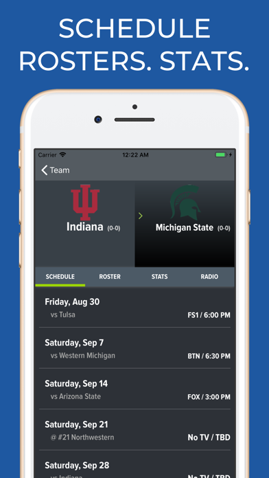 Head-to-head matchups for all of the Indiana football games. Link to live radio, get scores, schedules, rosters, tv channels, and stats. Indiana Football Schedules provides scores, links to live radio, schedules, tv channels, player profiles, and game matchups in one location. There is no faster way to find players, kickoff times, tv channels, or matchup information. Scores update during game day. Detailed stats compiled nightly. UNIVERSAL APP WITH IPAD SUPPORT! TWO APPS IN ONE! Love it! “…blazing quick access to game times (channels), rankings, and player information. So easy to use-Brilliant!" FEATURES ==================== TV Guide "...love the TV schedule. No longer have to look at my cable guide to look at my game schedule during College Game-day." UPDATED SCORES "This (is) one of the best apps for college football !! Gives you scores, schedules and rosters.” - Jims49 SWITCH ROSTERS IN ONE TAP "Really fast and easy to use. And best of all gives me all the info I’d like to see" - Herbleton Cruz SEE TEAM AND PLAYER STATS "Now I don't to search for players, rankings or scores. LOVE it!" - Travjan USE IT WITHOUT CELL OR WIFI "Works great in the stadium! Used it in the stadium – where cell phone service is spotty at best – with no problems at all. Love this app!" - NRodgers2003 Also includes: Rosters and win-loss records Updates when you connect to the Internet Sort by number, last name, first name, class and position Indiana Football Schedules by Rapid Roster. RapidRoster and AKW Ventures, LLC is not endorsed or affiliated with the NCAA or any college, university or school. Images used in the app are used for the sole purpose of identifying the respective teams, and remain the property of their respective owners.