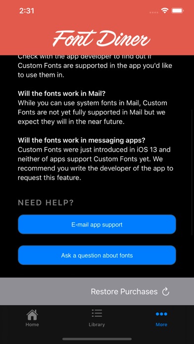 New to Custom Fonts in iOS 13? Check out this awesome video that explains how to use your new Font Diner fonts on your iPhone or iPad once they're installed: https://youtu.be/oAdzJxp0jcY Now you can enjoy our complete Font Diner Font Sets on your iOS device with our spiffy new app for iOS. Launched in 1996, the Font Diner has become a major resource for retro design software products. With more than 400 original typefaces for the graphic design industry, we've established a reputation as the premier retro display type foundry inspired by 1950s popular culture. Prior to installing or working with the Font Diner app, please review our Terms of Use and Privacy Policies here: https://www.fontdiner.com/app-policies/