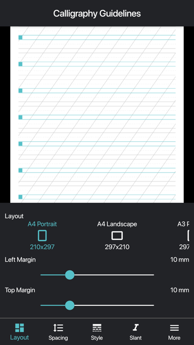 Calligraphy Guidelines is a comprehensive generator to design your guidesheets for daily handwriting practice or professional penman work and export them to PDF or high-res PNG formats. Productivity tool number one for every penman! No more buying expensive practice pads! Create and print worksheets on demand. A universal collection of adjustable settings in the application allows creating worksheets and templates for any script style Copperplate, Spencerian, Gothic, Italic and so on. Customize every aspect of calligraphy rulers: * Select one of 6 popular page layouts, such as A5, A4, A3, US Letter, US Legal and US Junior. * Choose Portrait or Landscape page orientation. * Define left, top, right, and bottom margins. * Select x-height size starting from 3mm. * Adjust spacing ratios for ascender, descender, and height of interline space. * Select your favorite style for ascenders, descenders, waistlines, and baselines from Solid, Dotted, and Dashed lines. Hide any of the lines using the Hidden style. * Choose a color for each type of line. * Define slant lines angle in diapason from 30 to 90 degrees, select color and adjust repeating frequency. * Watch your changes with an instant preview. * Export as a high resolution 300 dpi PNG image * Export, share or print as a vector PDF file.