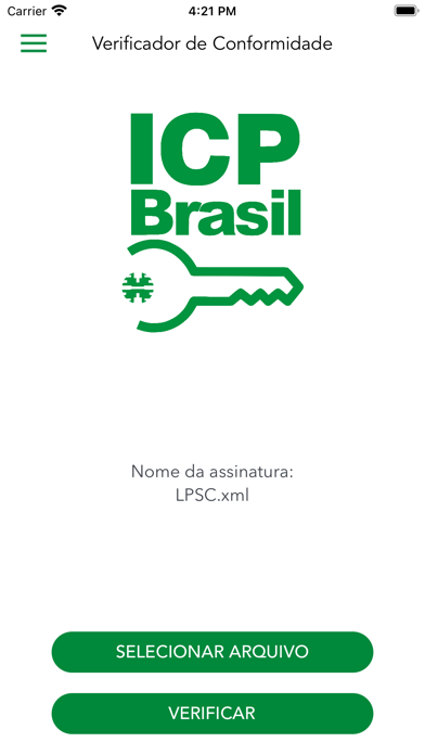 O Verificador de Conformidade do Padrão de Assinatura Digital ICP-Brasil é um serviço gratuito disponibilizado pelo ITI. Com o aplicativo móvel do verificador, você pode aferir se um arquivo assinado com certificado ICP-Brasil está em conformidade com o DOC-ICP-15. O sistema verifica os padrões CAdES, XAdES e PAdES. Quando o usuário envia um arquivo de assinatura digital, o aplicativo exibe um relatório com as informações referentes à conformidade da assinatura. Disponibiliza-se, também, a opção de realizar o download do relatório em formato PDF.
